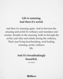 Life will have moments that are so beautiful and so magical they can steal your breath from your lungs. Other moments or circumstances will test the very fabric of your being pushing you mentally, physically, emotionally, financially or all these ways at once. It can bring you to your knees metaphorically or literally. A lot of life is routine, mundane even in the rhythms of daily routines, what to eat, work, school, kids, sports, religious activities, rinse, repeat. The ordinary takes up a lot of the days, weeks, even years of our lives.